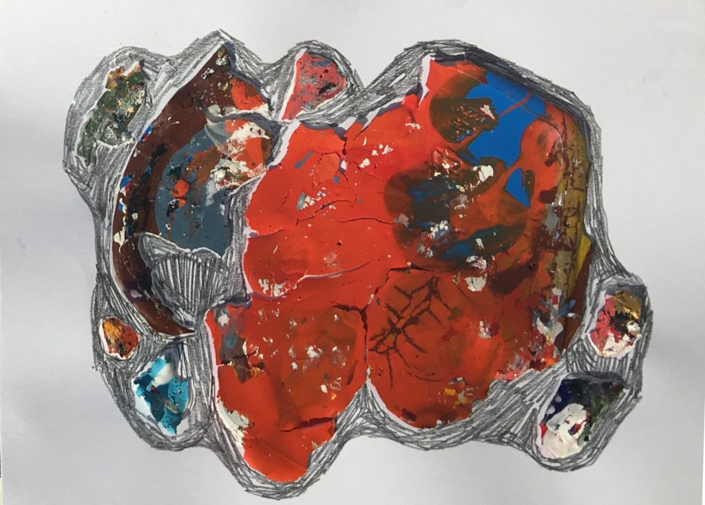 Acrylic Waste started in my art classroom in Markham, Ont., Cdn. As I cleaned student’s palettes of dried acrylic paint, I kept the pieces of plastic acrylic. What began as an entry into my Teacher sketchbook moved to larger pieces of paper and experiments with palette surfaces, layers, textures, and color. Sizes from 5x7in. to 3x7ft.