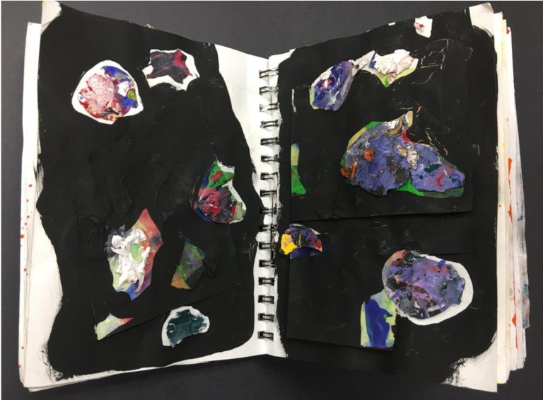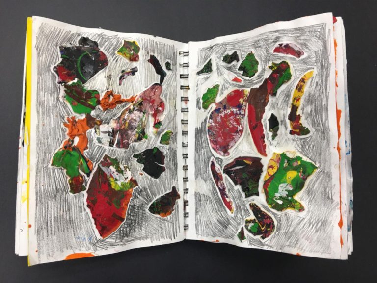 This work developed from my Art classroom (see sketchbook pages below). On any given day, I removed whole pieces of dried acrylic (plastic) from student’s palettes. I arranged the pieces in my sketchbook pages. I made marks around the acrylic pieces with soft pencil and paint. I explored this further outside the classroom. Mixing and layering colors and experimenting with pours, textures, and scale.